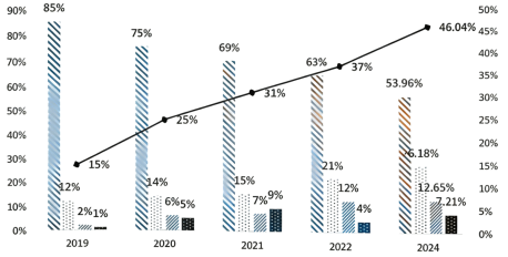 材料二 2019-2024年我国企业智能制造能力成熟度等级分布情况图