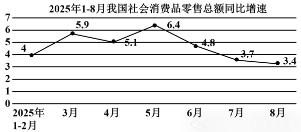 5.下图是2025年1—8月,我国社会消费品零售总额同比增长的分月统计情况;1—8月整体统计同比增长4.6%,其中,家具类、家用电器和音像器材类、通讯器材类等“以旧换新”补贴商品零售额分别增长18.6%、14.3%、7.3%。(注:图文数据,均来源于国家统计局)据图文数据可以得出的结论是: