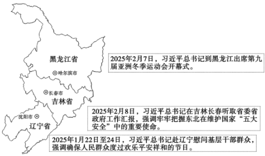 8.2025年年初,习近平总书记在20天之内两赴东北,足迹涵盖了东北三省(如下图所示)。