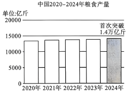 7.C【解析】2020-2024年我国粮食总产量逐年提高,我国人均舶食占有量达到500公斤,做到了谷物基本自给、口粮绝对安全,这稳步夯实我国粮食安全根基,为建设农业强国奠定坚实基础。也有利于守性不发生规模性返贸的底线。②③入选。粮食产量提高不能必然推出农民家庭能营性收入提高,也与乡村基础设施的改善无关,③④不选。