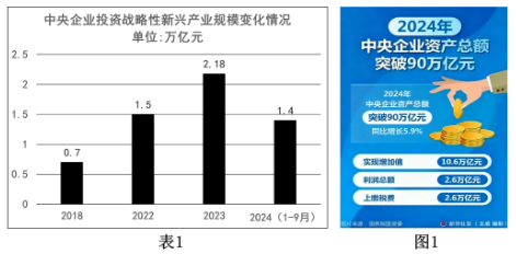 4.表1是中央企业投资战略性新兴产业规模变化情况,图1是中央企业2024年运行情况,据此,可以推断: