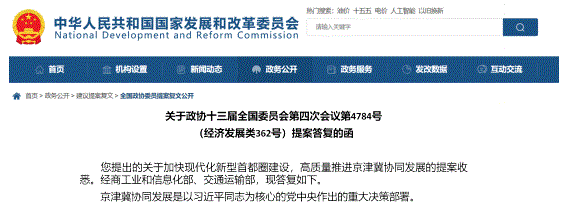 4.同学浏览网站时,关注到国家发展和改革委员会公布的“关于加快现代化新型首都圈建设,高质量推进京津冀协同发展”提案答复函。答复函对提案的核心建议作出答复,通报了阶段性成效并明确了后续推进方向。