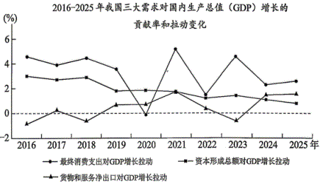 12.B【解析】①从图表可以看出,最终消费支出对GDP增长的拉动幅度长期高于另外两项需求,符合我国实际经济特征:消费是经济增长的基础性动力,是当前经济增长的第一拉动力,正确。②我国当前消费已经成为经济增长的主要动力,投资并不起主导作用;同时图表也显示资本形成总额(投资)的拉动幅度长期低于最终消费,排除。③净出口对GDP增长拉动为负,仅代表净出口对GDP增长的贡献同比下降,不意味着我国贸易顺差持续收窄;且图表中净出口拉动有明显波动,后期由负转正,无法得出“顺差持续收窄”的结论,排除。④后期最终消费拉动幅度回升,长期领先于投资拉动,反映我国经济结构不断优化,增长动力正从传统投资驱动向消费驱动转型,正确。