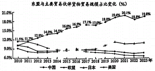有效信息:东盟与主要贸易伙伴货物贸易规模占比变化折线图→可从东盟与中国的关系、经济全球化的角度,说明2010年以来,东盟与中国货物贸易占比持续攀升,东盟对中国的贸易依存度不断提高,区域经济一体化程度加深。